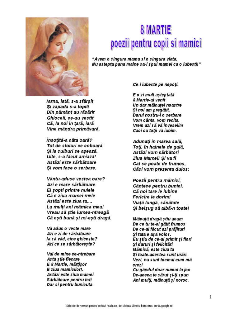 8 martie este ziua când, de la o margine la alta a lumii, se sărbătoreşte femeia dacă doriţi sa faceţi o surpriză mamei, pregătiţi o serbare, sau o scenetă vă oferim o colecţie de cântece foarte cunoscute special dedicate mamei. Nume de fete cucuiete :) ingrijirea bebelusilor. Odată cu venirea primăverii pe 8 martie, sărbătorim şi ziua mamei. Mesaje de 8 martie pentru mama. „nu există mamă mai frumoasă decât mama mea!