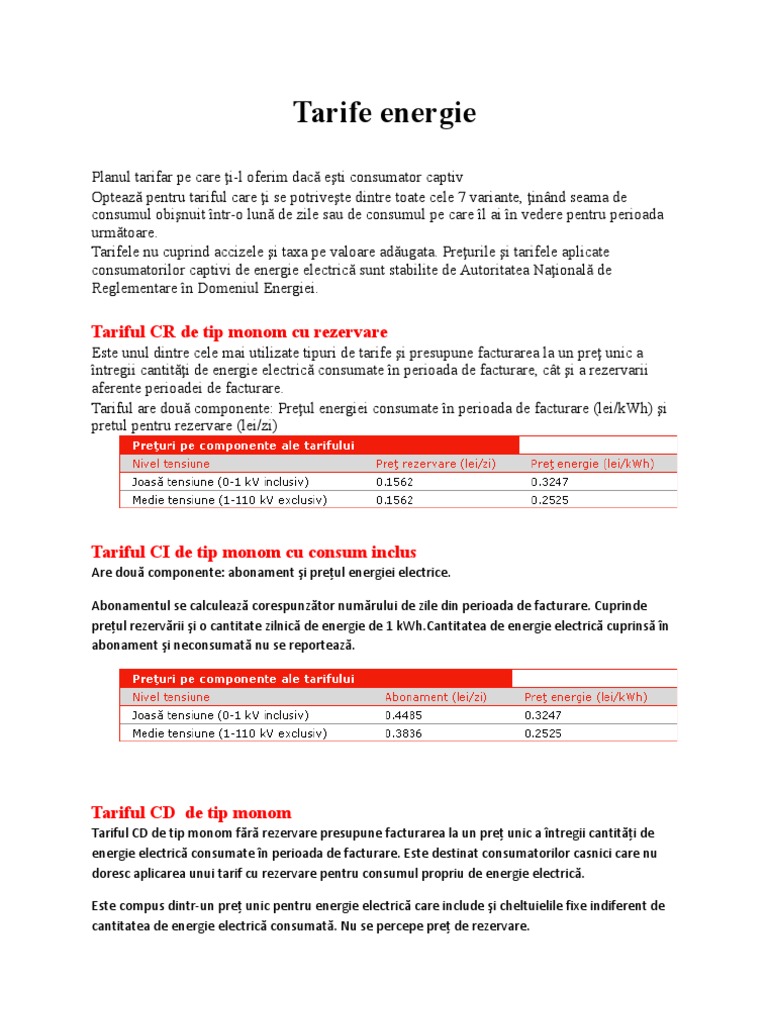 vizitati articolul complet aici : https://www.europafm.ro/consiliul-concurentei-a-postat-comparatoarele-de-tarife-pentru-gaze-naturale-si-energie-electrica/ Pentru consumatorii casnici stabilite de autoritatea nationala de reglementare în domeniul energiei valabile de la 1 iulie 2008 conform ordinului nr. Pentru consumatorii casnici, racordati la retelele electrice de joasa tensiune, tariful solicitat este de 180,25 bani/kwh, fata de 179 bani/kwh cat este acum. Tarifele la energia electrică pentru consumatorii casnici vor scădea cu 0,34% în semestrul i 2018, faţă de trimestrul iv 2017, deşi facturile finale la energie electrică ale consumatorilor care beneficiază de serviciul universal, categorie din care fac parte în special consumatorii casnici din.
